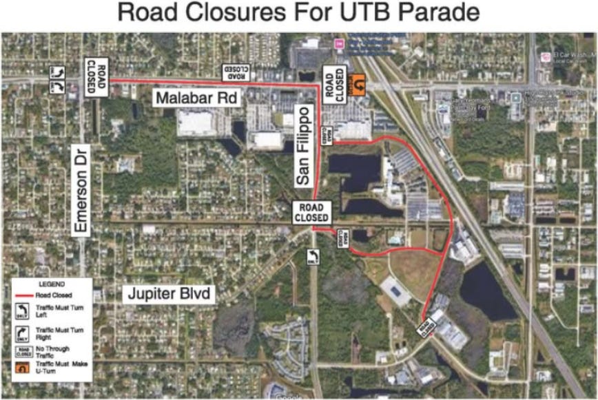 To accommodate the parade, Malabar Road will be completely closed in both directions between Emerson Drive and San Filippo Drive beginning at 9 a.m. San Filippo Drive will also be closed between Malabar Road and Jupiter Boulevard. Roads will reopen once the parade clears, estimated around noon. Drivers should expect heavy delays and plan alternate routes.