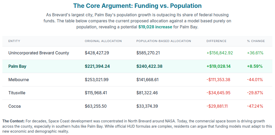 While official HUD formulas consider multiple factors beyond population (such as poverty rates and housing conditions), residents have a strong, data-driven case to advocate for a funding distribution that more equitably reflects Palm Bay's significant population and associated needs. This is a specific point to consider raising in your comments.