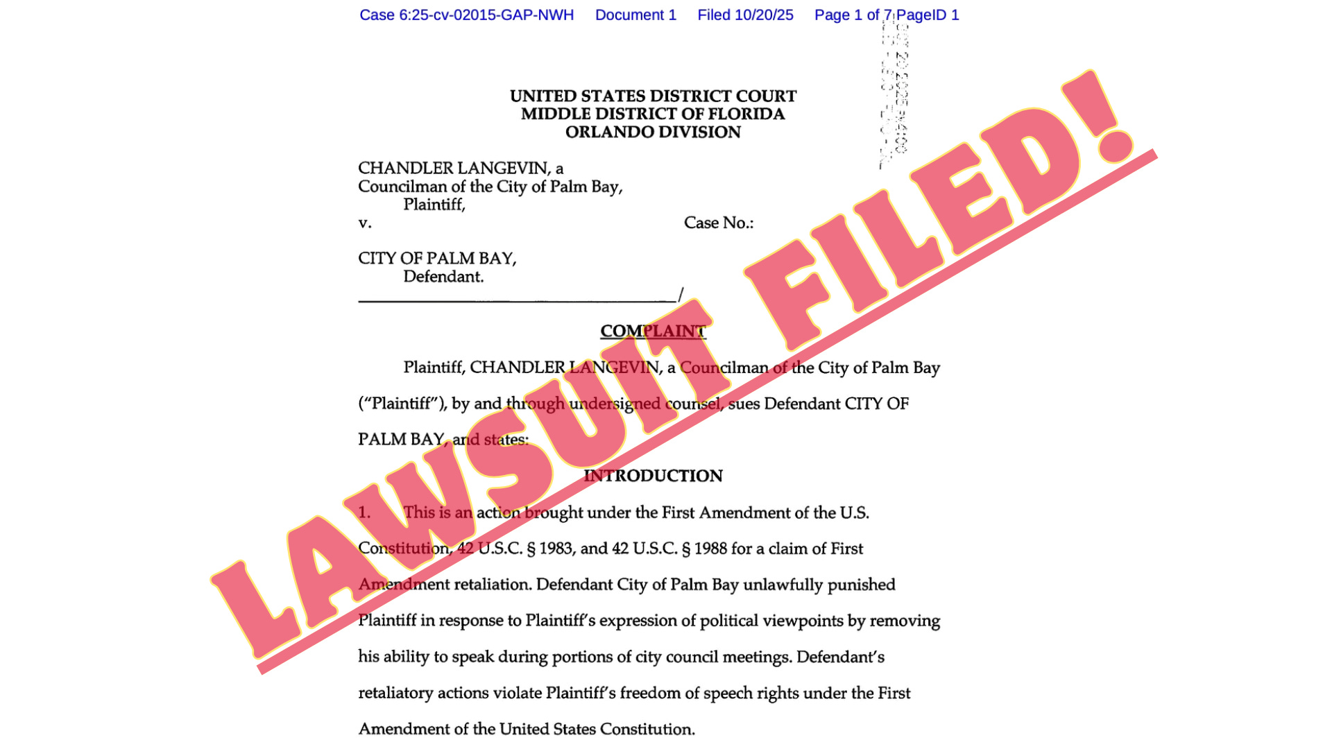 PALM BAY, FL - October 21, 2025 - A Palm Bay city councilmember has filed a federal lawsuit against the city, claiming that new rules limiting when council members can speak during meetings violate the First Amendment. Councilmember Chandler Langevin filed the lawsuit in the U.S. District Court for the Middle District of Florida, arguing that the cityâs procedural changes silence his voice and prevent him from representing his constituents.This case brings to light critical issues concerning free speech rights, governmental procedures, and the extent to which elected officials are bound by city meeting regulations. Beyond the legal arguments, the lawsuit raises questions about public trust in city government, Particularly when an elected official sues the very body they serve on.