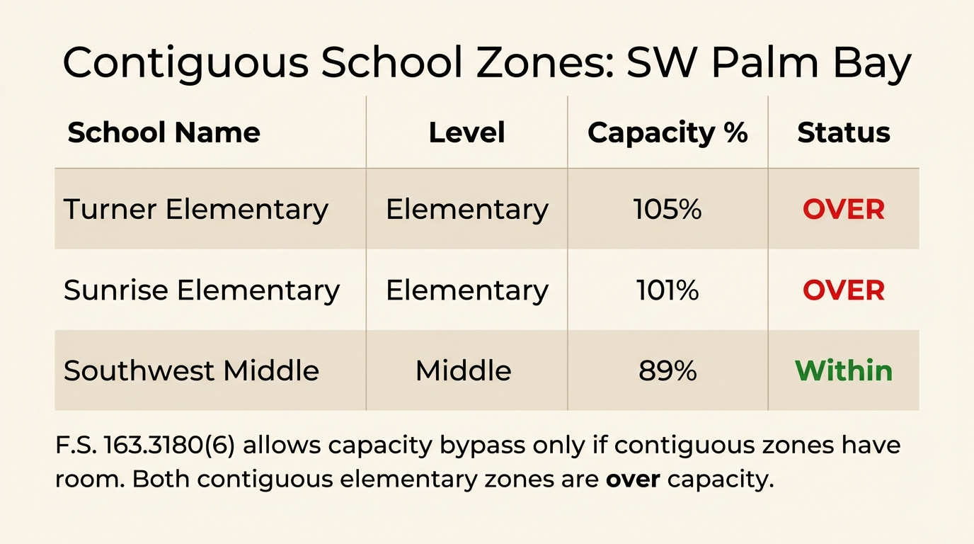 For southwest Palm Bay, the contiguous zones are not abstract. They are Sunrise Elementary (101% capacity, projected 117% by 2027), Westside Elementary (105%, projected 118% this year), Southwest Middle School (insufficient capacity), and Bayside High (90%, projected to cross 100% by 2027). These schools are both the primary service zones and the contiguous zones. The statutory bypass requires available capacity in a neighboring attendance area. There is none. The schools that are supposed to absorb the overflow are the ones that are already full. The bypass is on the books; it just doesn’t apply to southwest Palm Bay right now.