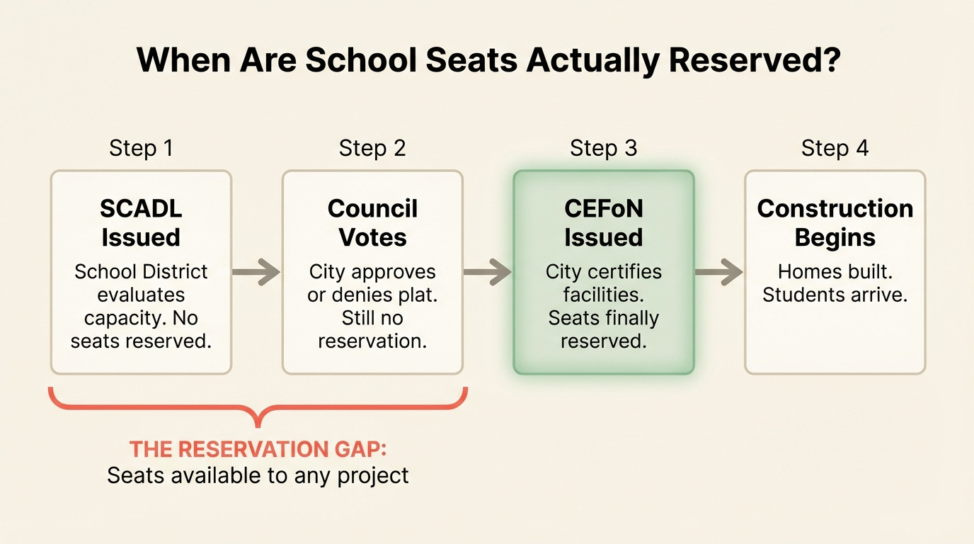 The reservation gap. ILA Section 13.3 states that school capacity is not formally reserved for a specific project until the local government issues a Certificate of Adequate Public Facilities, known as a CEFoN. A SCADL finding of adequacy does not hold those seats. Multiple SCADLs can be issued against the same school zone simultaneously. A zone could receive favorable findings for several projects before any of them reach the CEFoN stage, at which point the available seats are already spoken for.