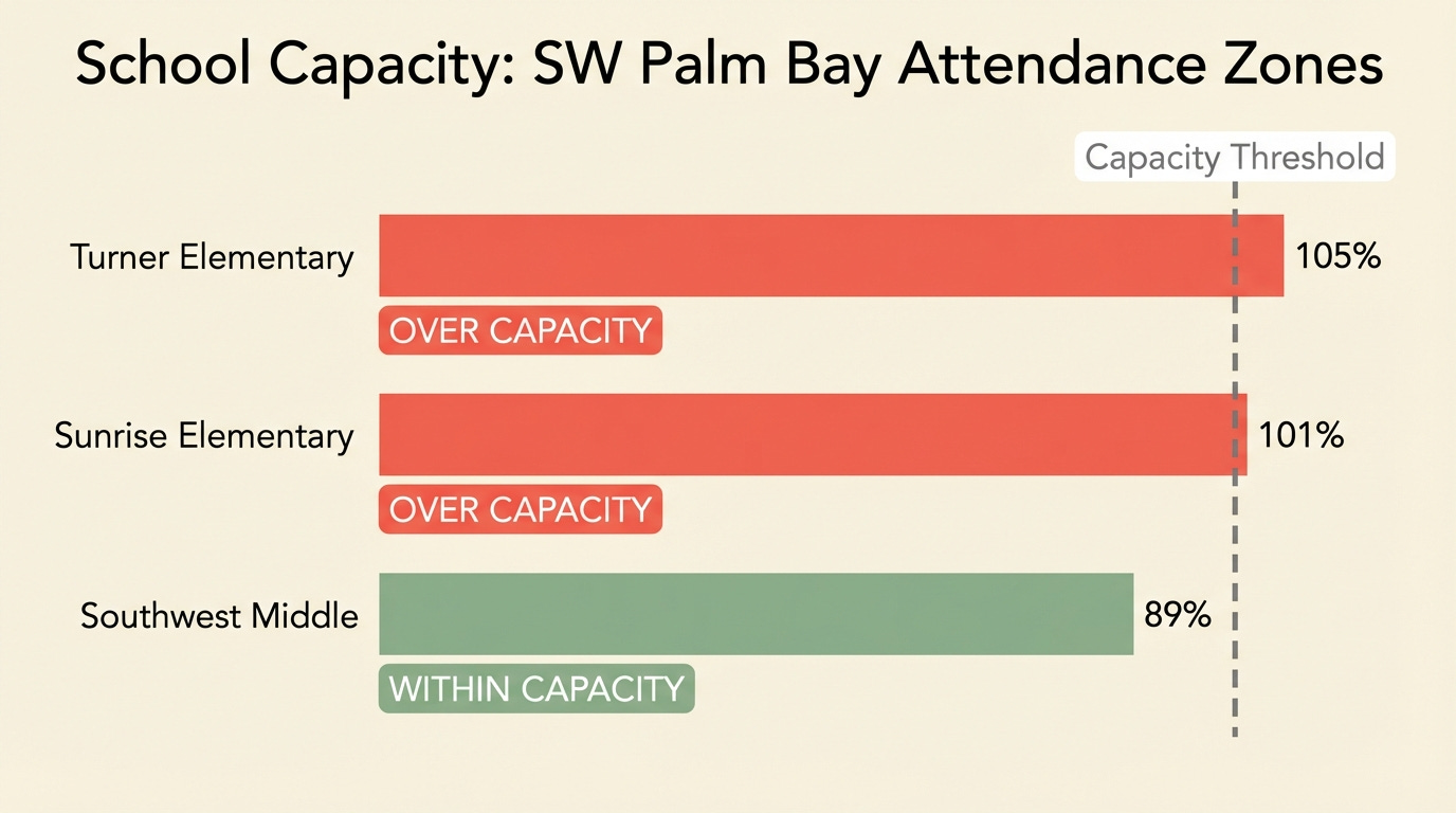 Palm Bay, FL -- Two elementary schools serving southwest Palm Bay are already above 100% capacity. The middle school serving that same area lacks sufficient capacity to absorb projected students. Bayside High is at 90% and projected to cross 100% by 2027. And development proposals for thousands of additional homes in those attendance zones keep arriving at City Hall.